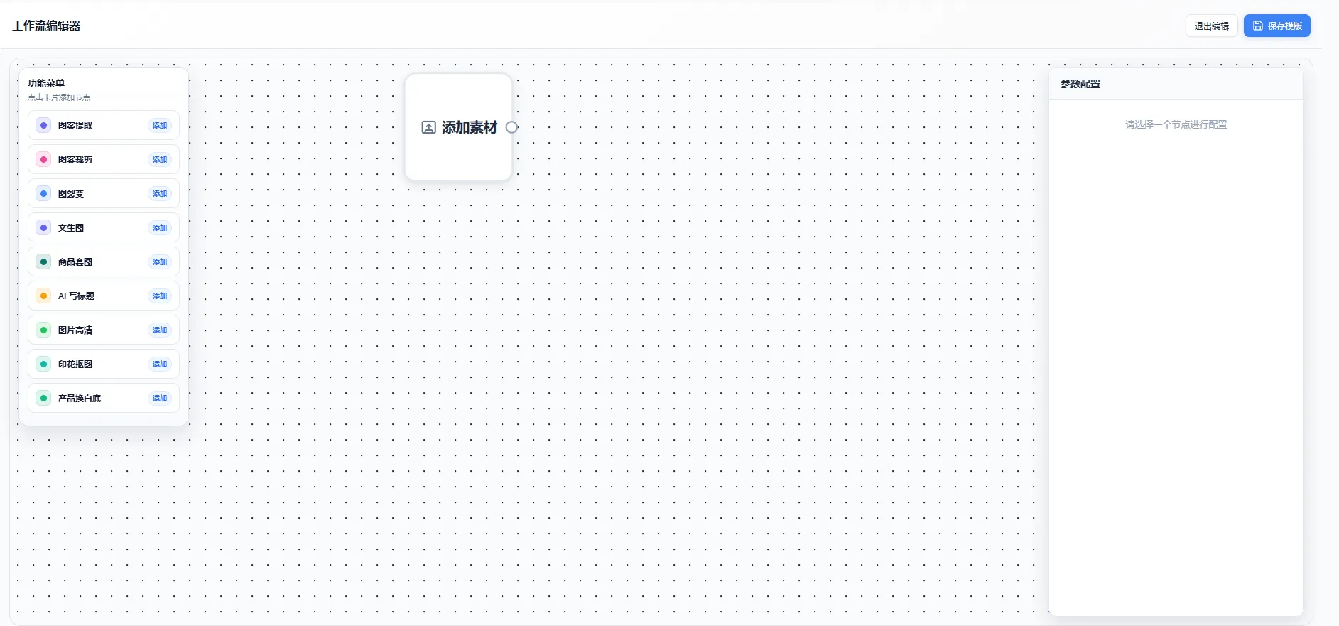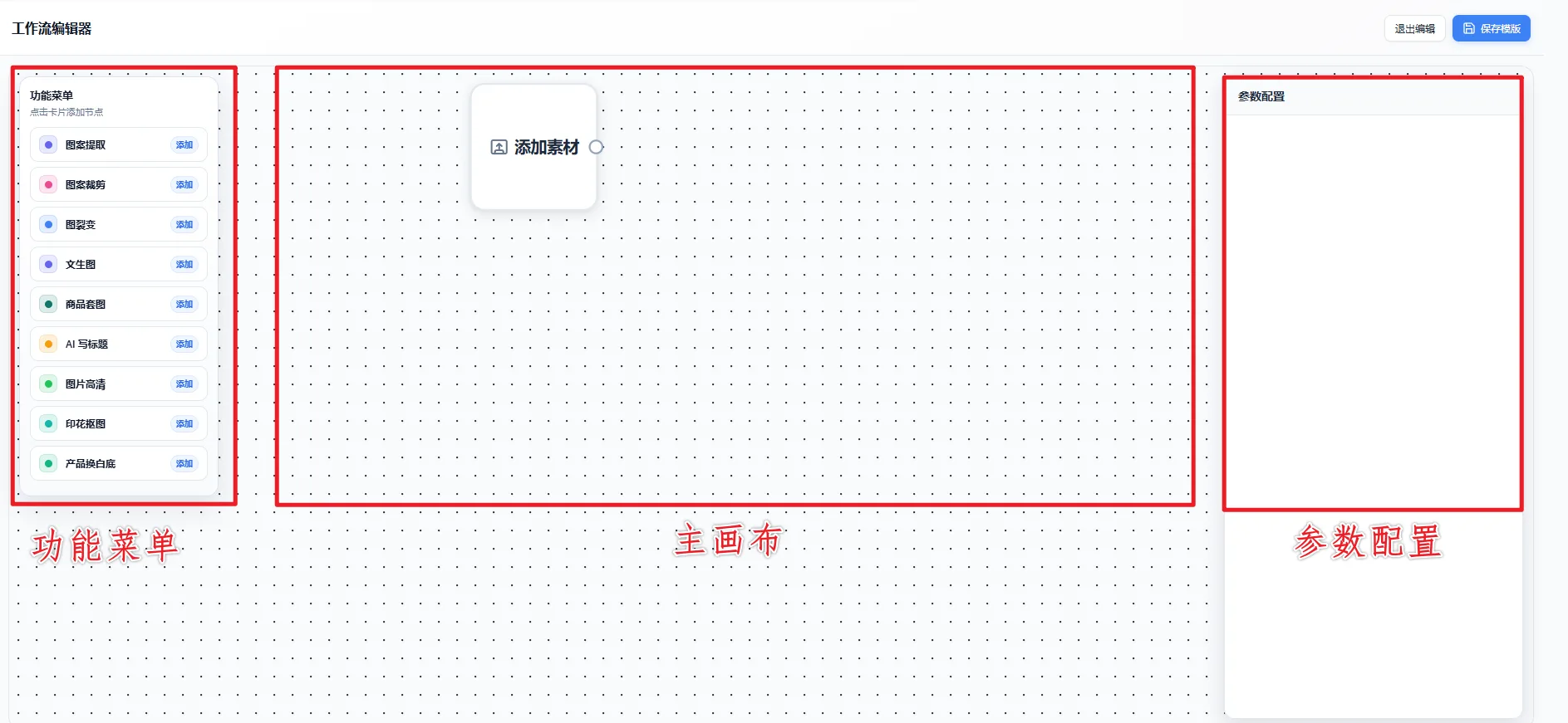 工作流模版编辑器页面分为三个区域,从左到右依次为功能菜单,主画布,参数配置面板