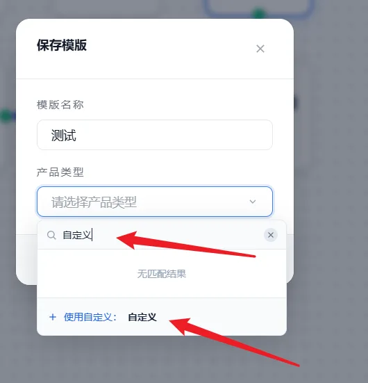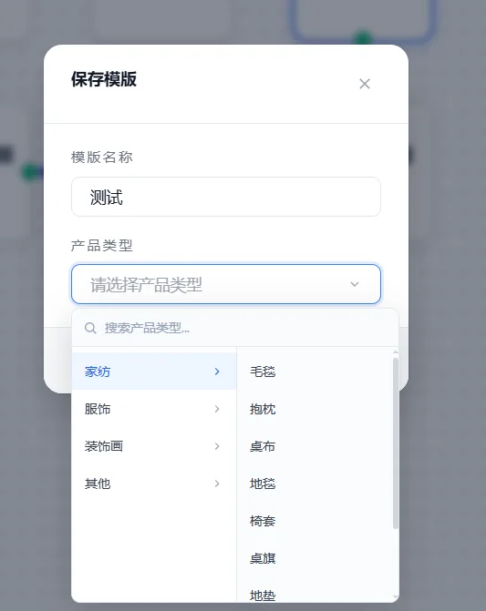 点击保存模版,需要填写模版名称,选择产品类型,便于后续管理