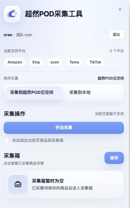 功能使用教程商品采集1、采集插件安装本页总览1、采集插件安装 1、下载插件安装包后解压缩 点击下方按钮下载最新版浏览器采集插件安装包:插件下载安装 2、打开浏览器的开发者模式(以谷歌Chrome浏览器为例) 第一步,复制 chrome://extensions/ 后到浏览器网址栏内打开,点击打开右上角开发者模式开关 第二步,拖拽解压后的文件夹(注意是文件夹,不是压缩包)到网页内,完成安装 3、登录超然POD账号开始使用