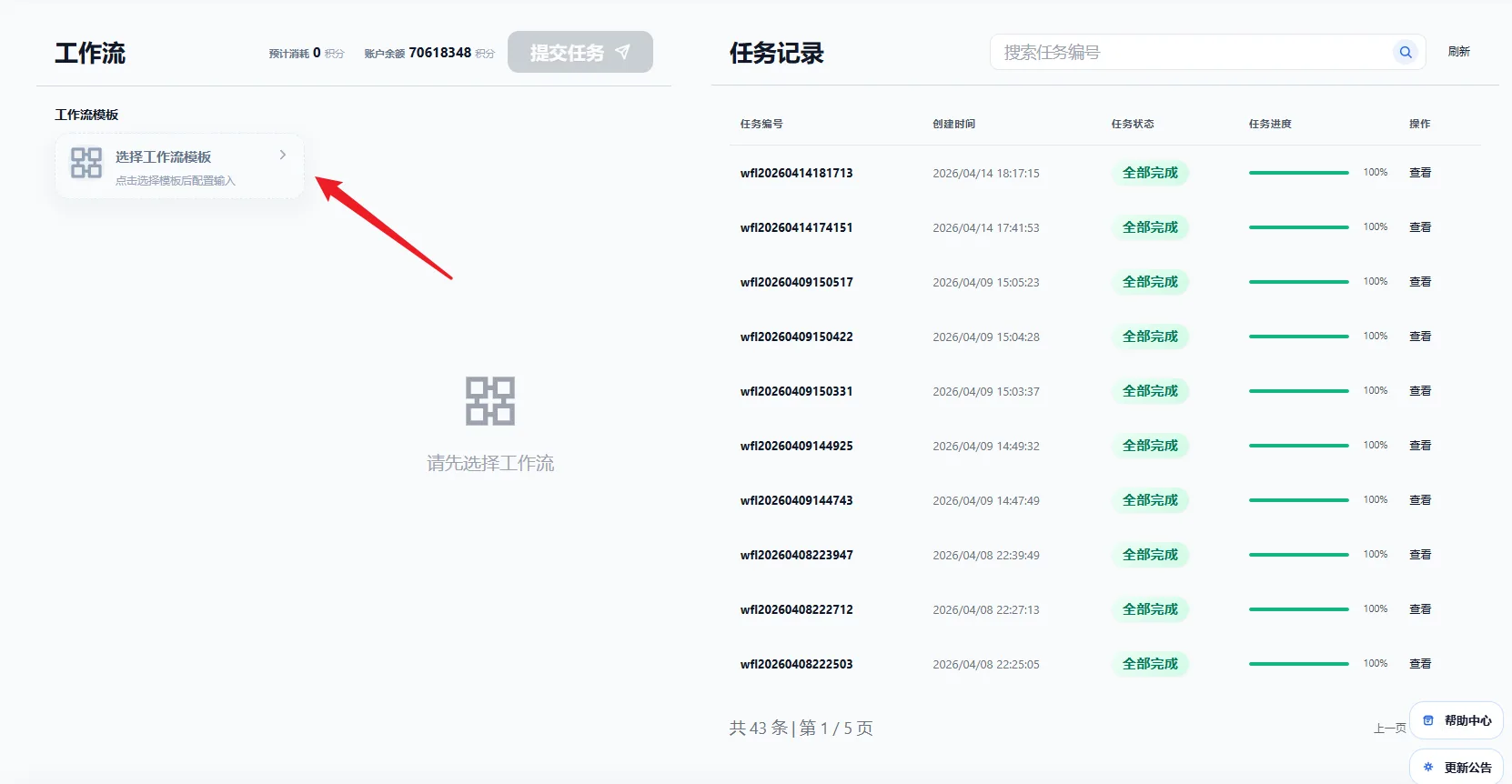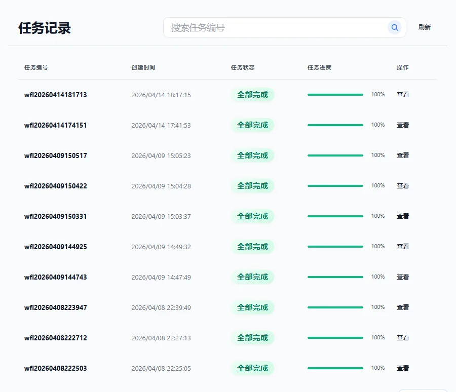 提交任务后,新的任务记录将出现在右侧任务记录区,可在这里查看任务编号、任务状态、任务进度