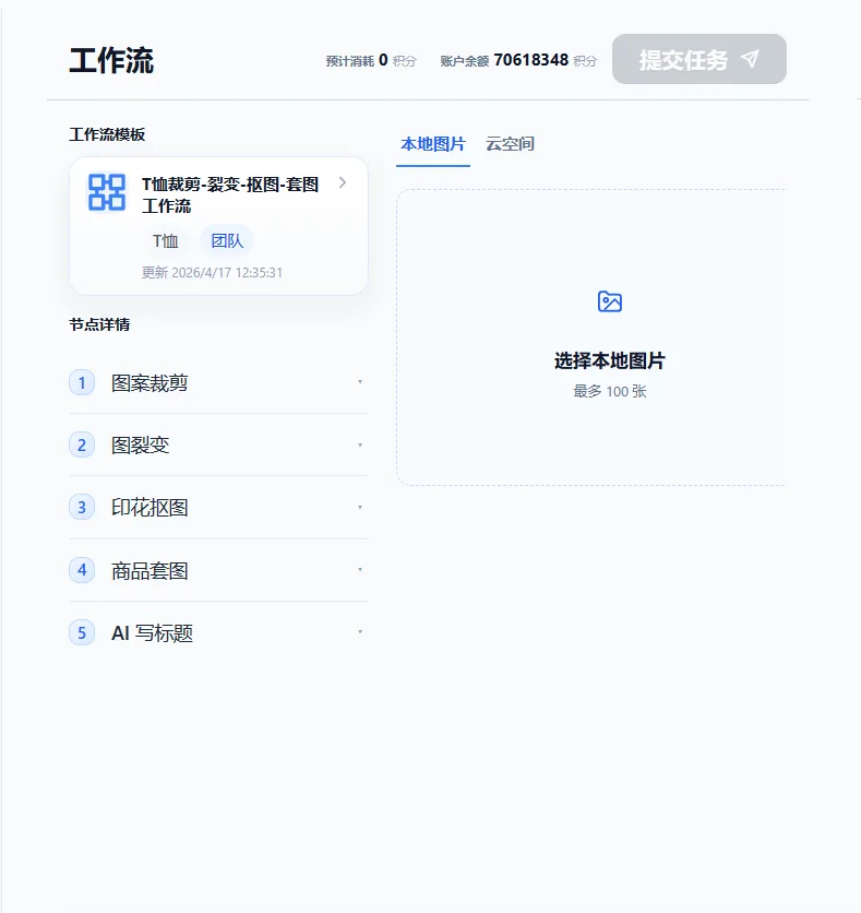 选定工作流模版,给定初始输入后,系统将计算出预计消耗积分