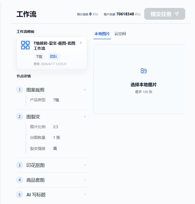 比如第一个节点是图裂变,那么就需要选择图片作为初始输入