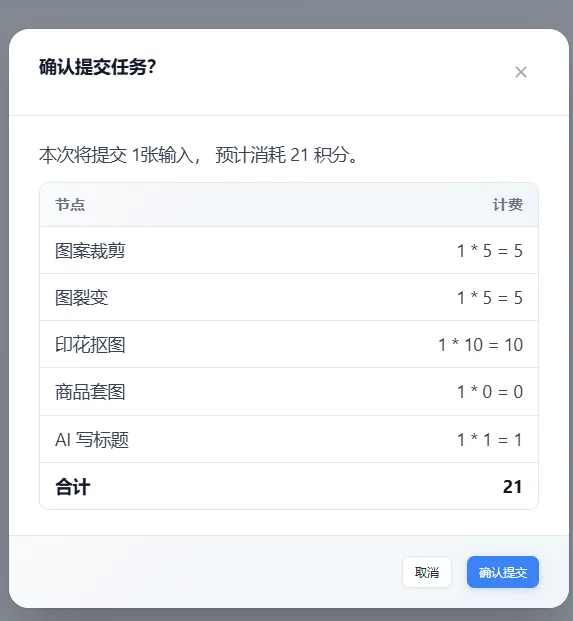 点击提交任务,出现的确认弹窗内将展示具体的消费细节,确认无误后确认提交,即完成任务创建