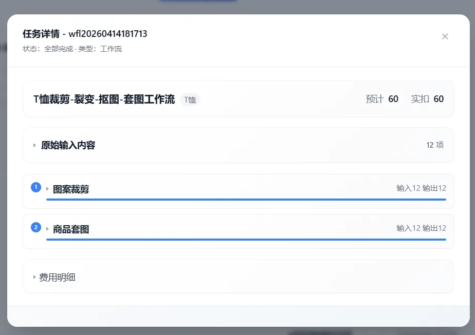 点击查看按钮,将打开详情弹窗,可在弹窗内查看具体的输入和输出等各种任务细节