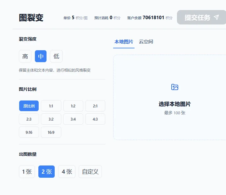 图裂变功能可以在保留原图内容的同时进行一定程度的裂变,同时支持改图片比例,比如说,一个1:1比例的抱枕爆款图案可以裂变成2:3的毛毯图案,9:16的手机壳图案