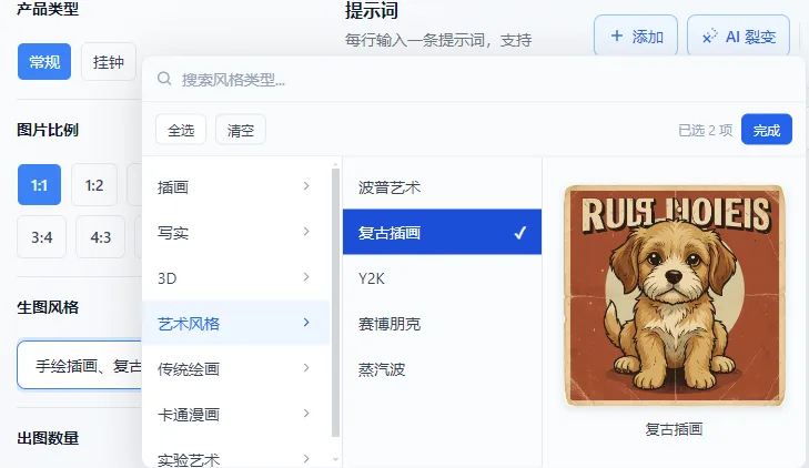 超然POD内置了26种POD类目的爆款风格,无需在提示词内输入风格提示词,选中风格参数,即可轻松生成对应风格图片