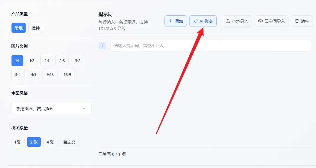 提示词的输入,支持通过TXT和XLSX文件导入,每行一条提示词